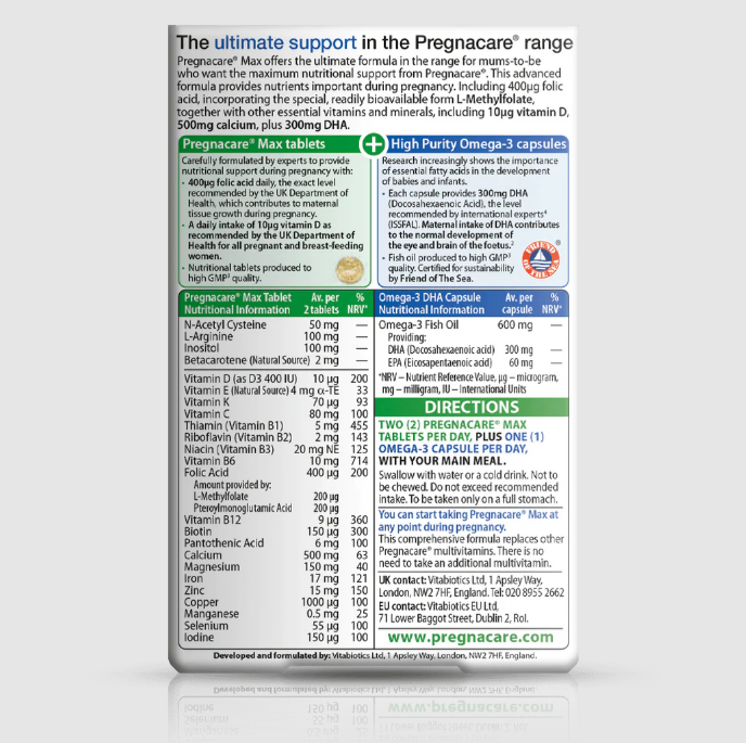 Pregnacare Max کاملترین مکمل برای مادران باردار است که میخواهند در دوران بارداری بیشترین حمایت تغذیهای را برای خود و جنینشان فراهم کنند.