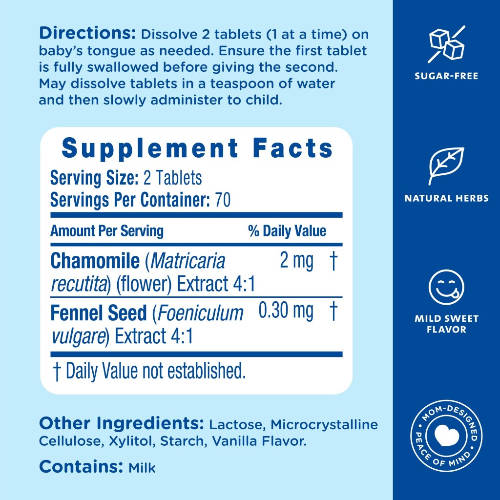 فرمولاسیون این قرصها بهگونهای طراحی شده که بهسرعت در دهان نوزاد حل میشود و احساس آرامش و راحتی را در هر ساعت از شبانهروز فراهم میسازد.