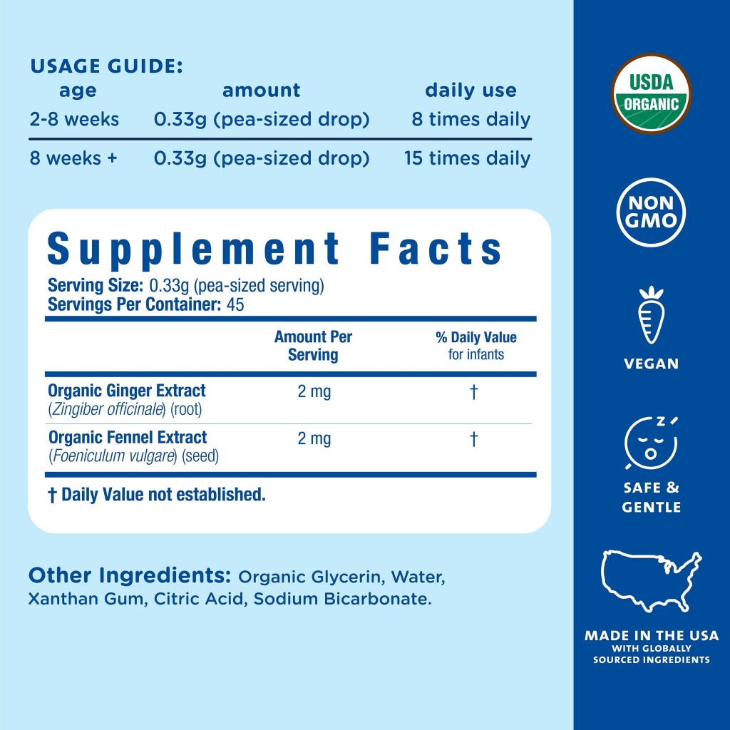 این محصول نسخهی ژلی از پرفروشترین Gripe Water آمریکا است و استفاده از آن بسیار آسان بوده و بهآرامی روی پستانک یا مستقیماً در دهان کودک قابل استفاده است.