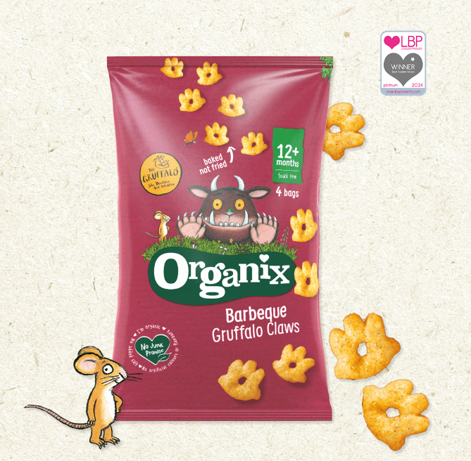اسنک ترد و سرگرمکننده با طعم ملایم باربیکیو و شکل «چنگال گرافالو»، ویژه کودکان ۱۲ ماه به بالا.