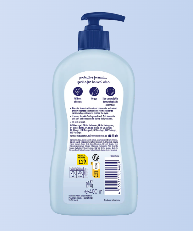 ژل شستشوی کودک بیوبن (Bübchen Wash Gel) با فرمول ملایم حاوی عصاره بابونه و پروتئین گندم**، پوست و مو کودک را از سر تا پا بهآرامی تمیز کرده و همزمان آن را نرم و مرطوب نگه میدارد. این شوینده برای استفاده روزانه طراحی شده و حتی با شستشوی مکرر نیز باعث خشکی پوست نمیشود.