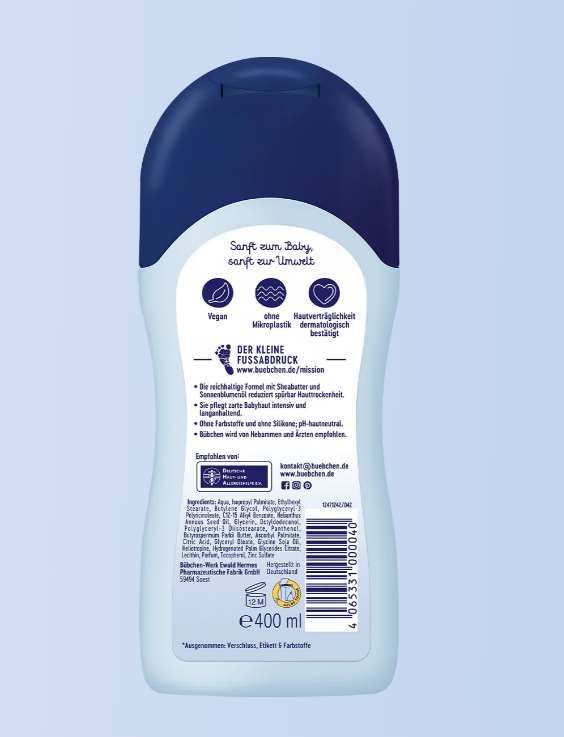 لوسیون کودک بیوبن، Bübchen Pflege Lotion، لوسیون مرطوبکننده نوزاد، لوسیون کودک شی باتر، لوسیون کودک با روغن آفتابگردان، مرطوبکننده پوست نوزاد آلمانی، لوسیون کودک وگان، مراقبت پوست نوزاد